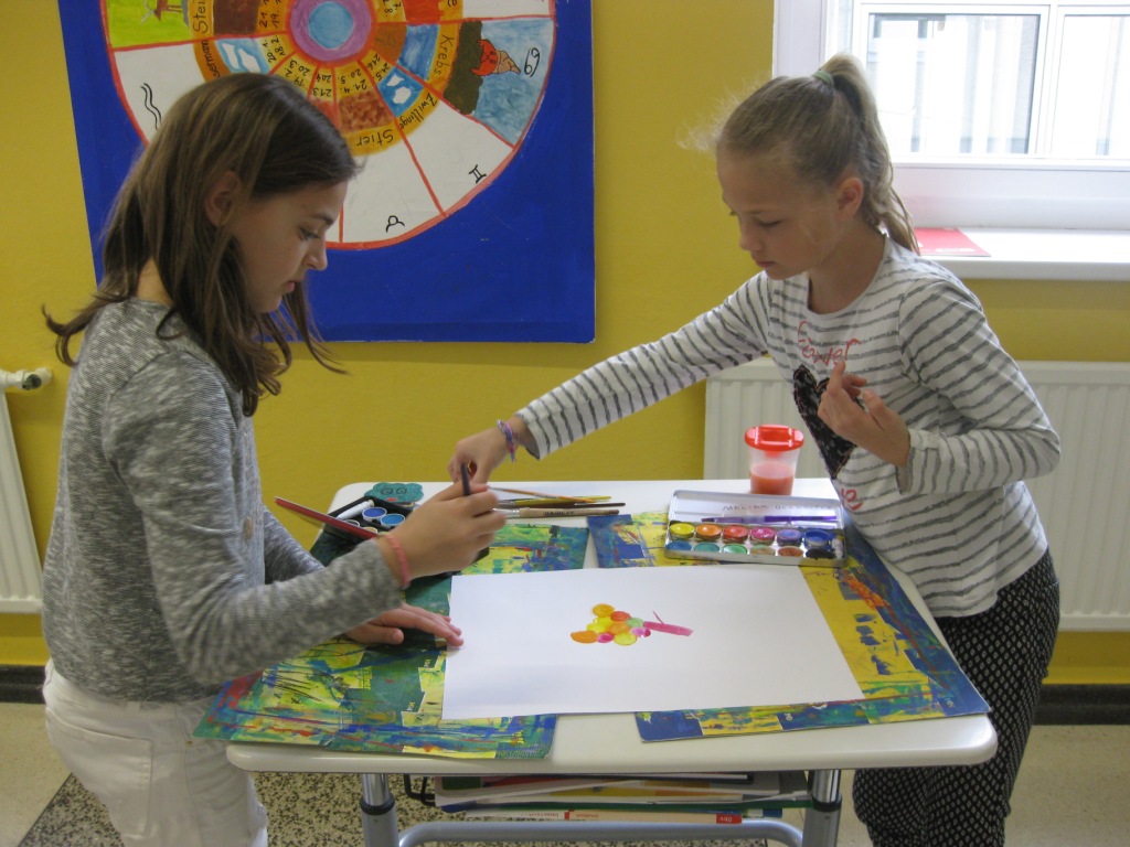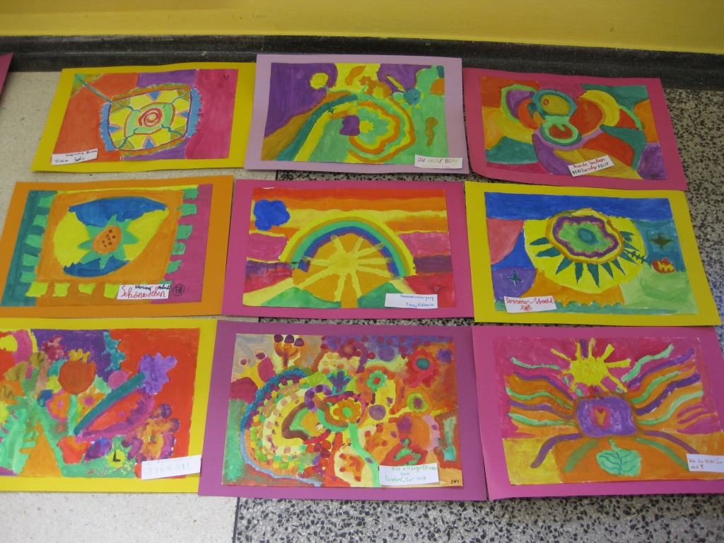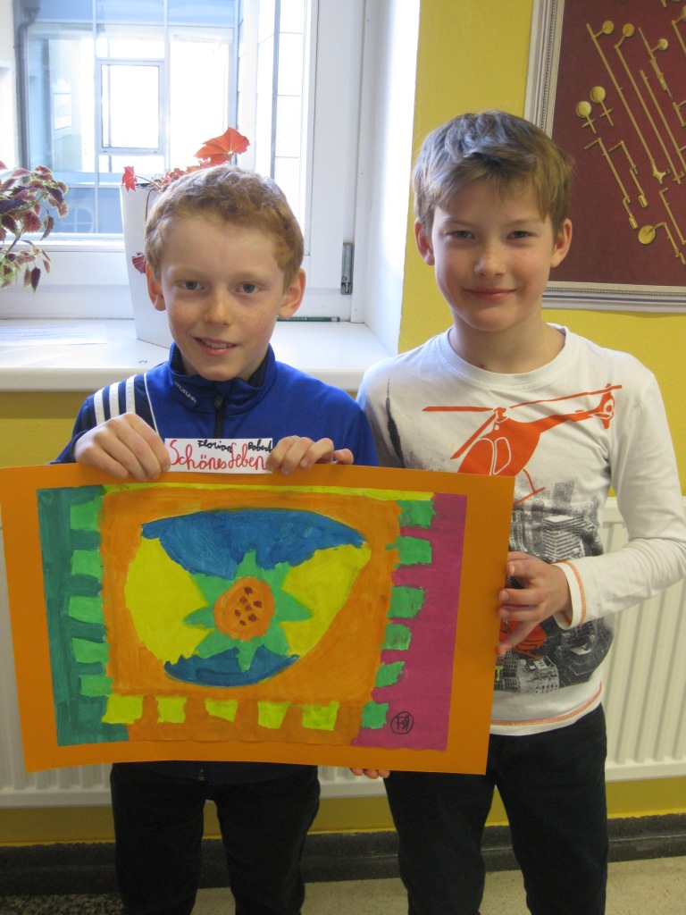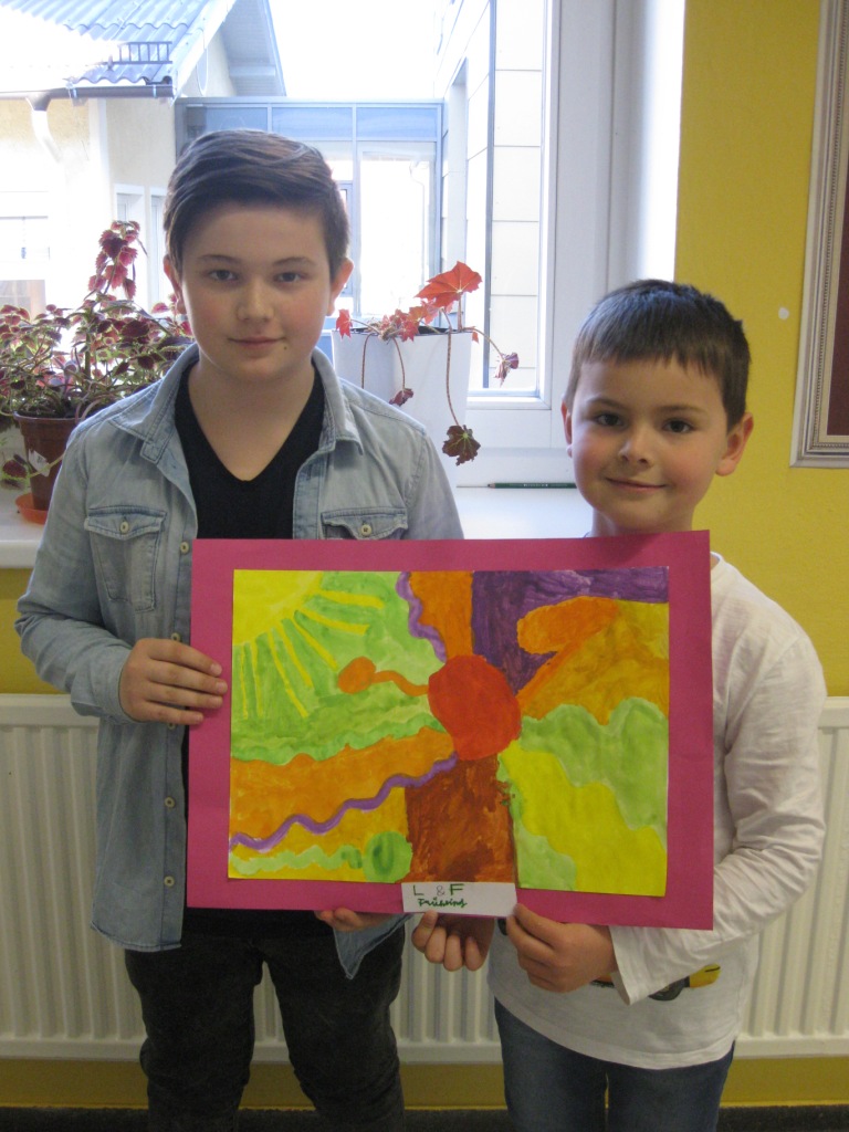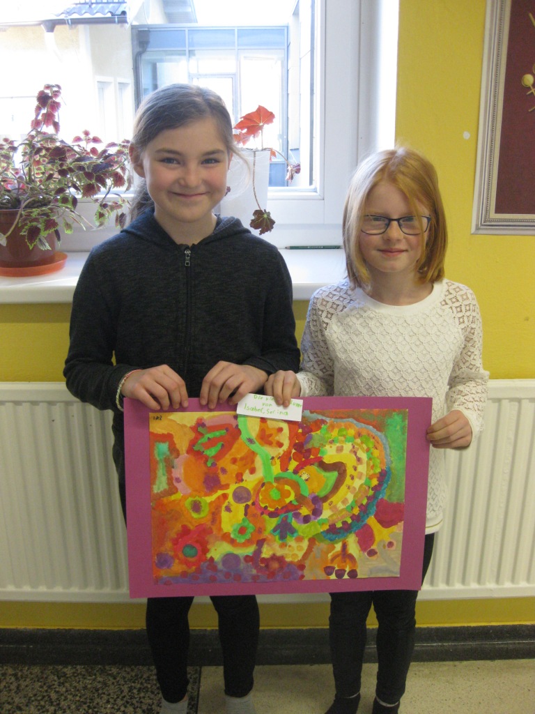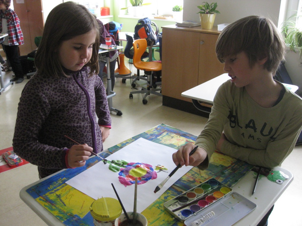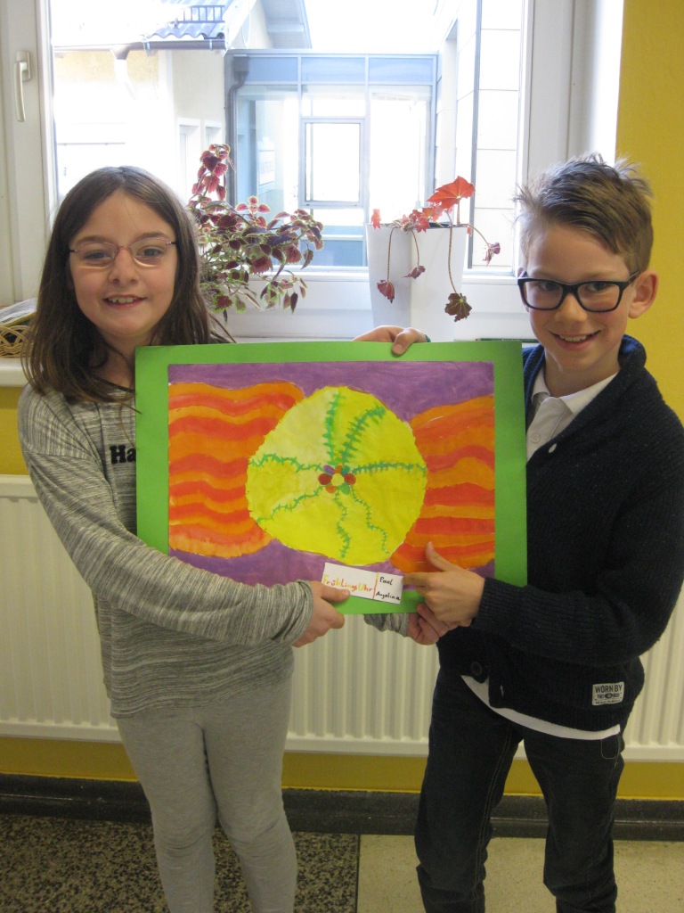 Unser Auftrag war, den Frühling in die Schule zu holen, also ein Frühlingsbild zu gestalten und das, ohne miteinander zu reden. So unter dem Motto: "Lass es entstehen!" zeichneten je zwei Kinder auf einem Blatt von der Bildmitte ausgehend nach außen.