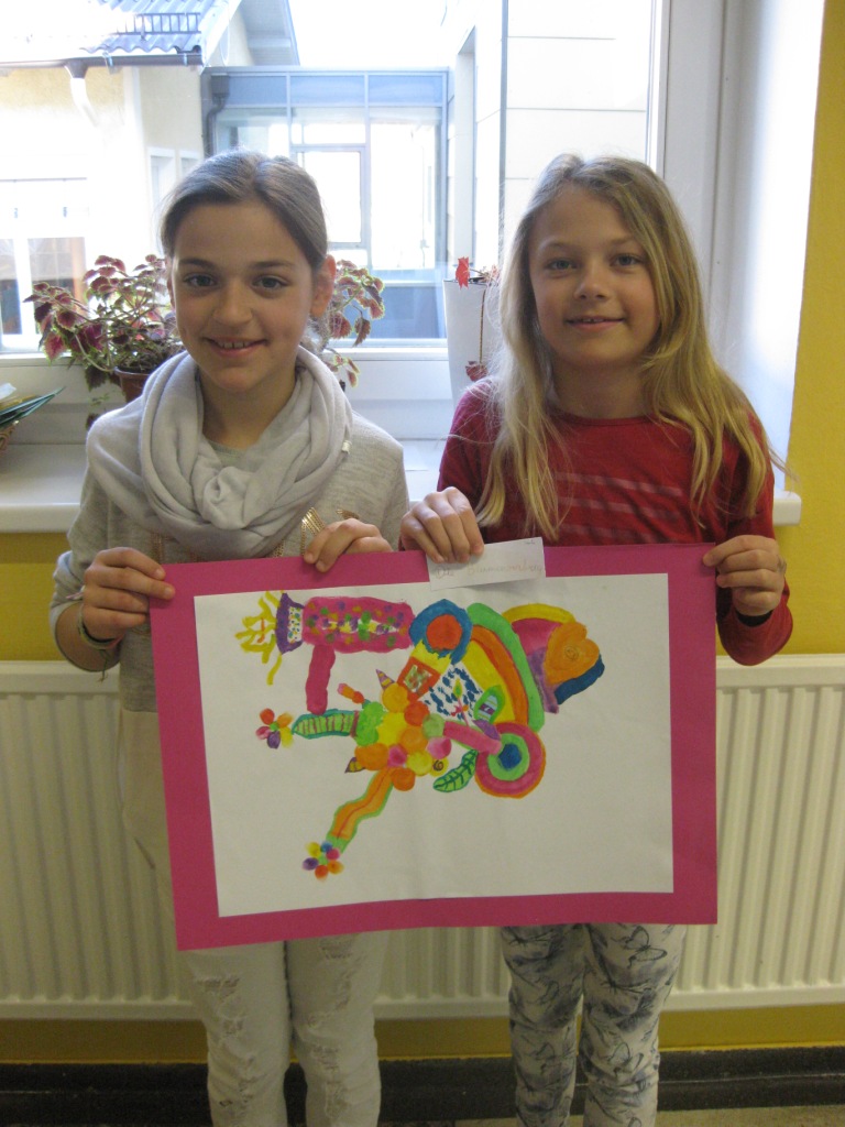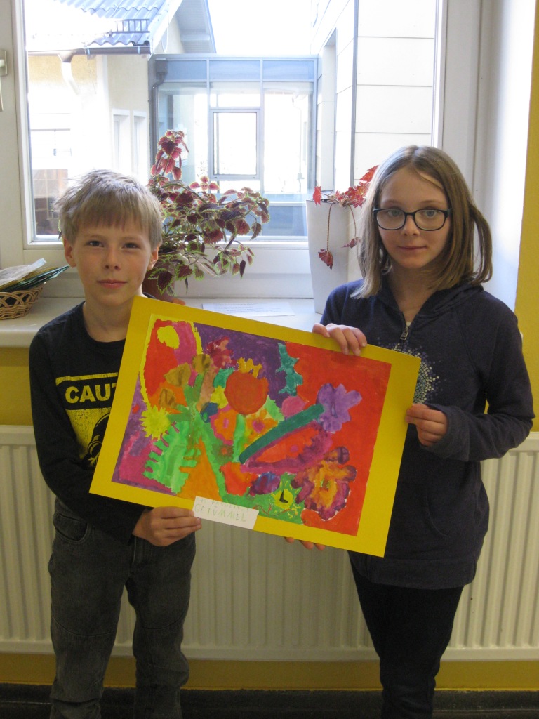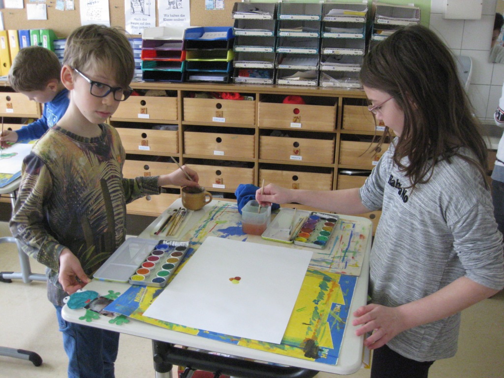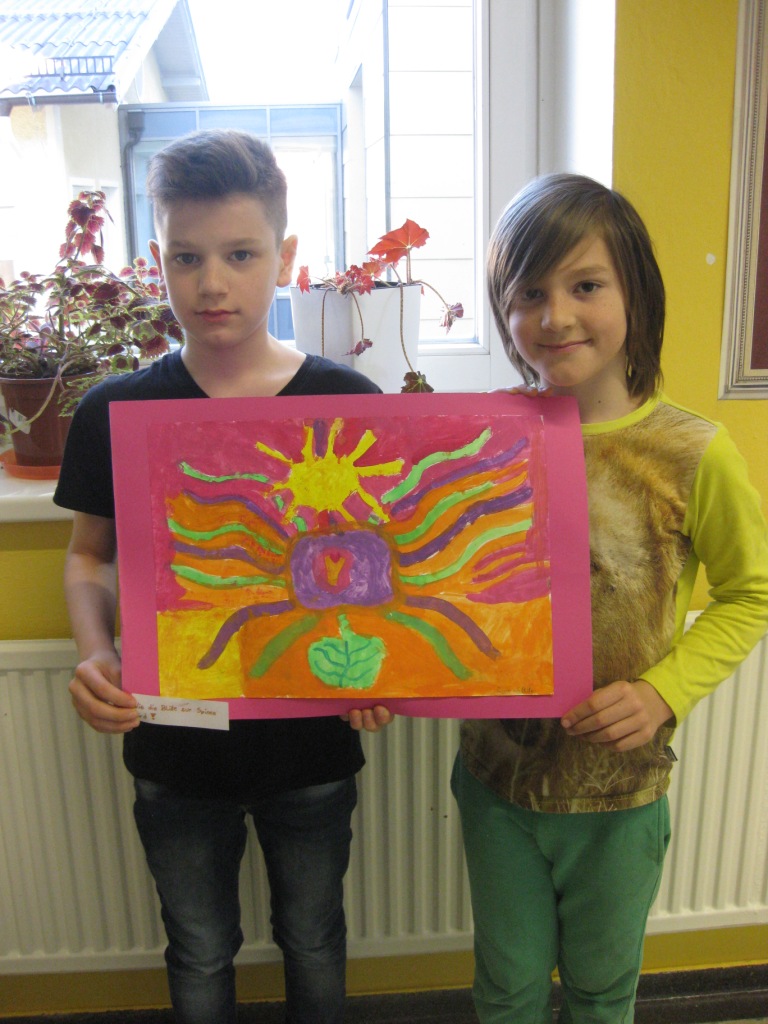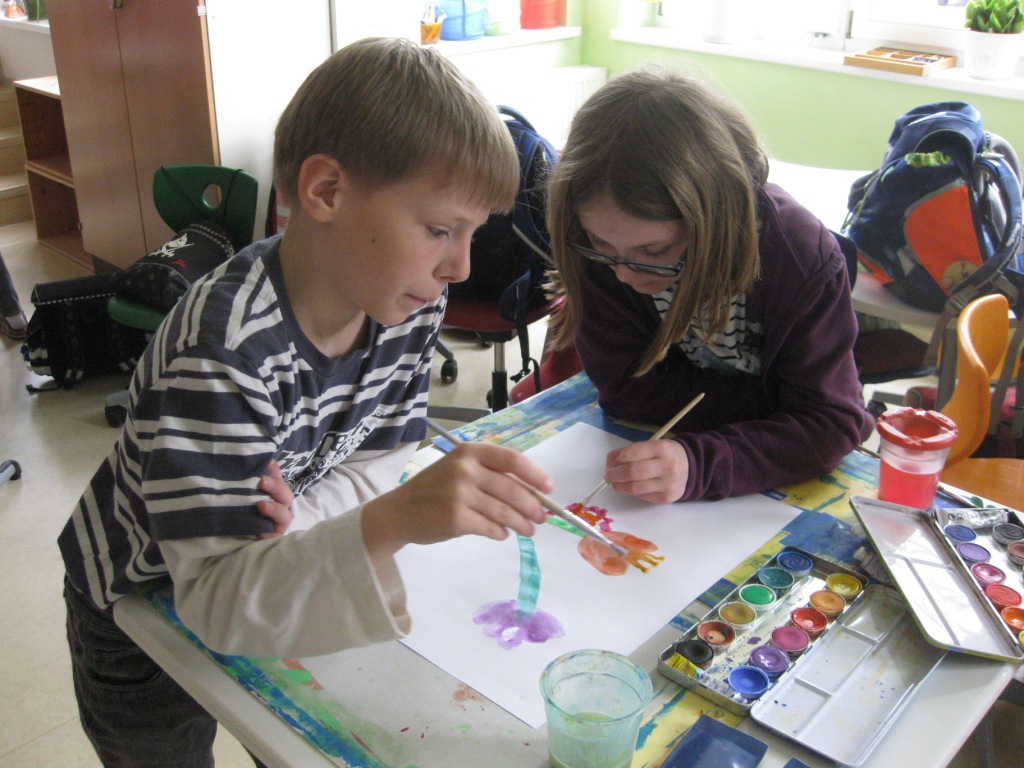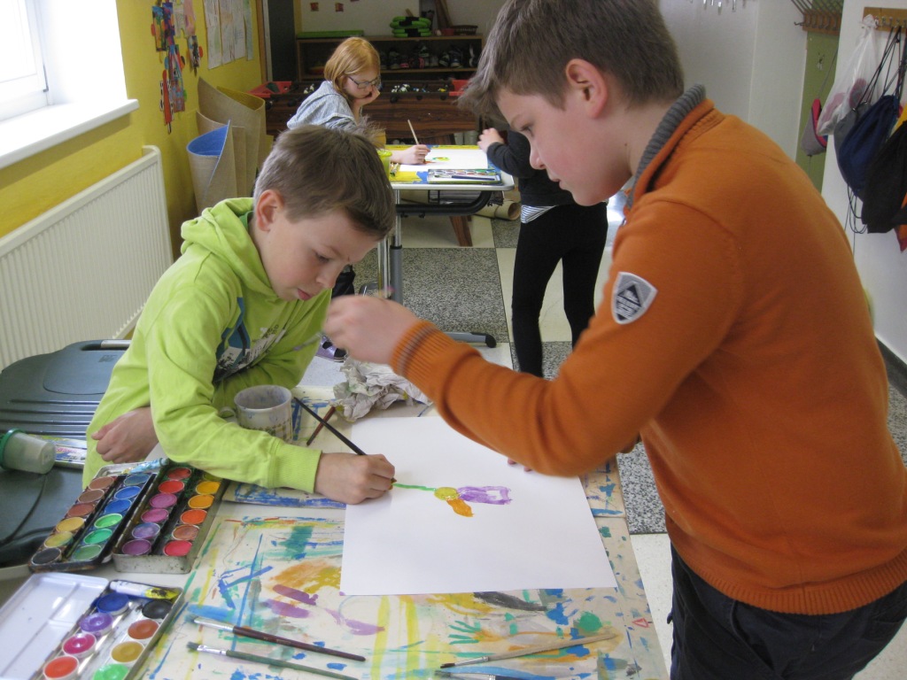 Unser Auftrag war, den Frühling in die Schule zu holen, also ein Frühlingsbild zu gestalten und das, ohne miteinander zu reden. So unter dem Motto: "Lass es entstehen!" zeichneten je zwei Kinder auf einem Blatt von der Bildmitte ausgehend nach außen.