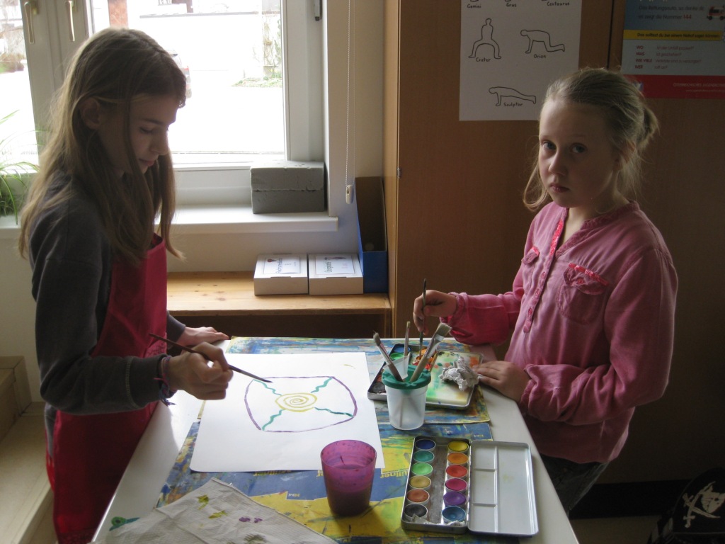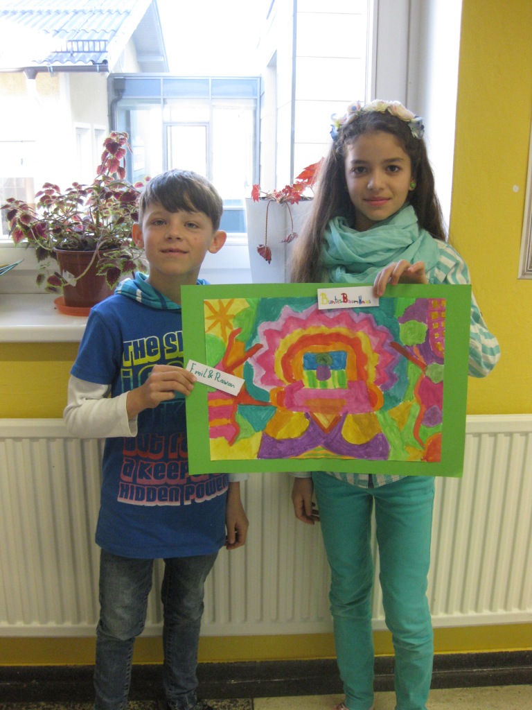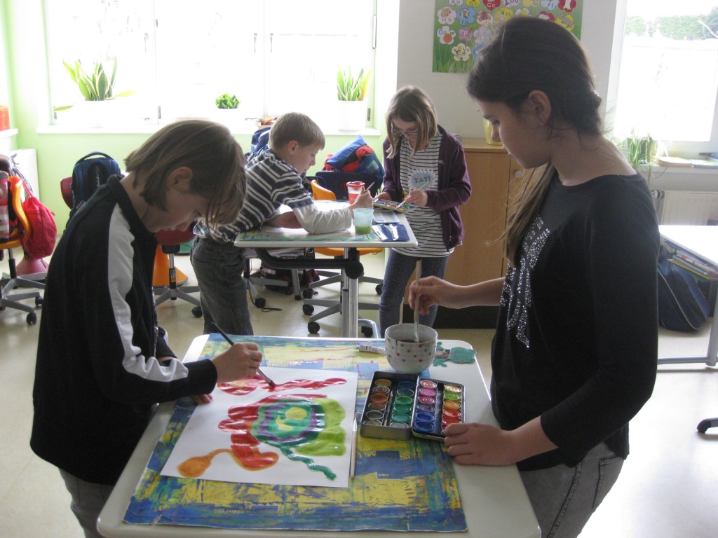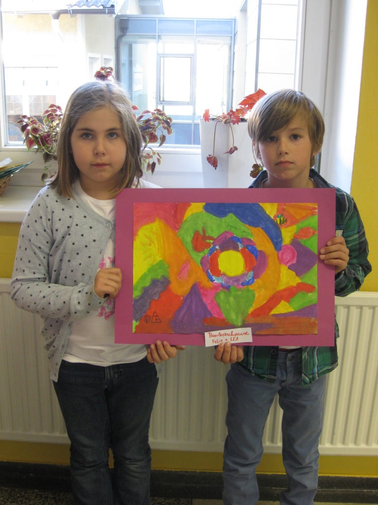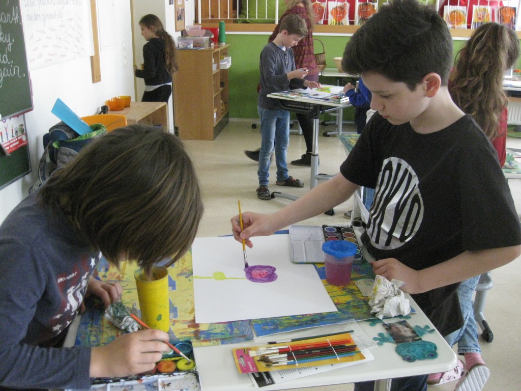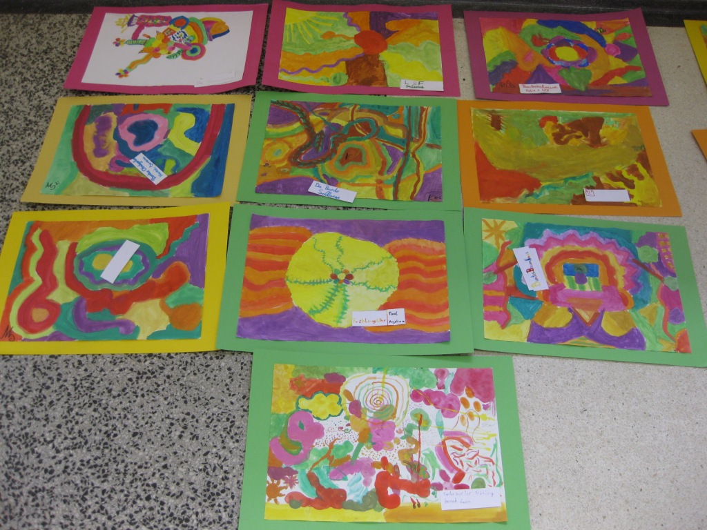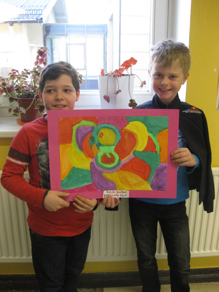 Unser Auftrag war, den Frühling in die Schule zu holen, also ein Frühlingsbild zu gestalten und das, ohne miteinander zu reden. So unter dem Motto: "Lass es entstehen!" zeichneten je zwei Kinder auf einem Blatt von der Bildmitte ausgehend nach außen.