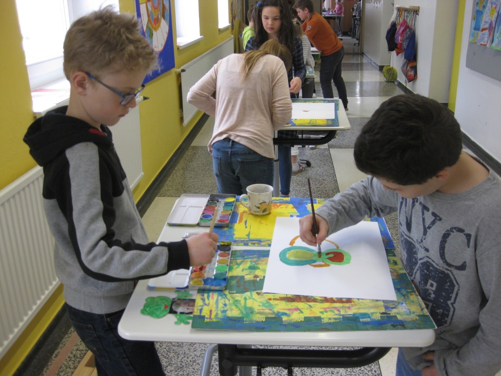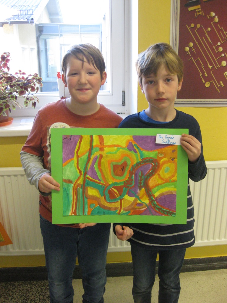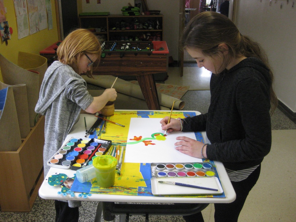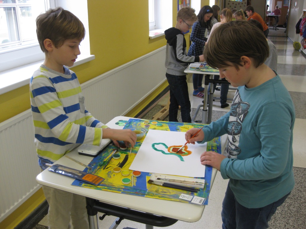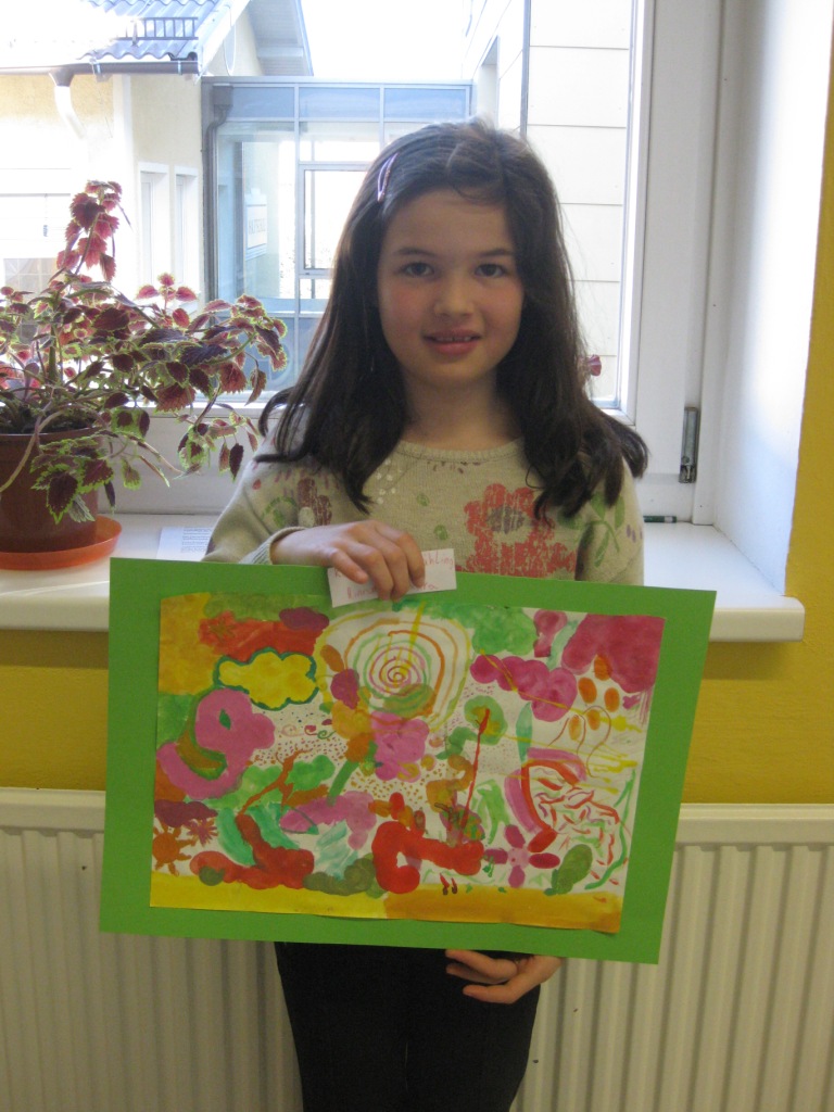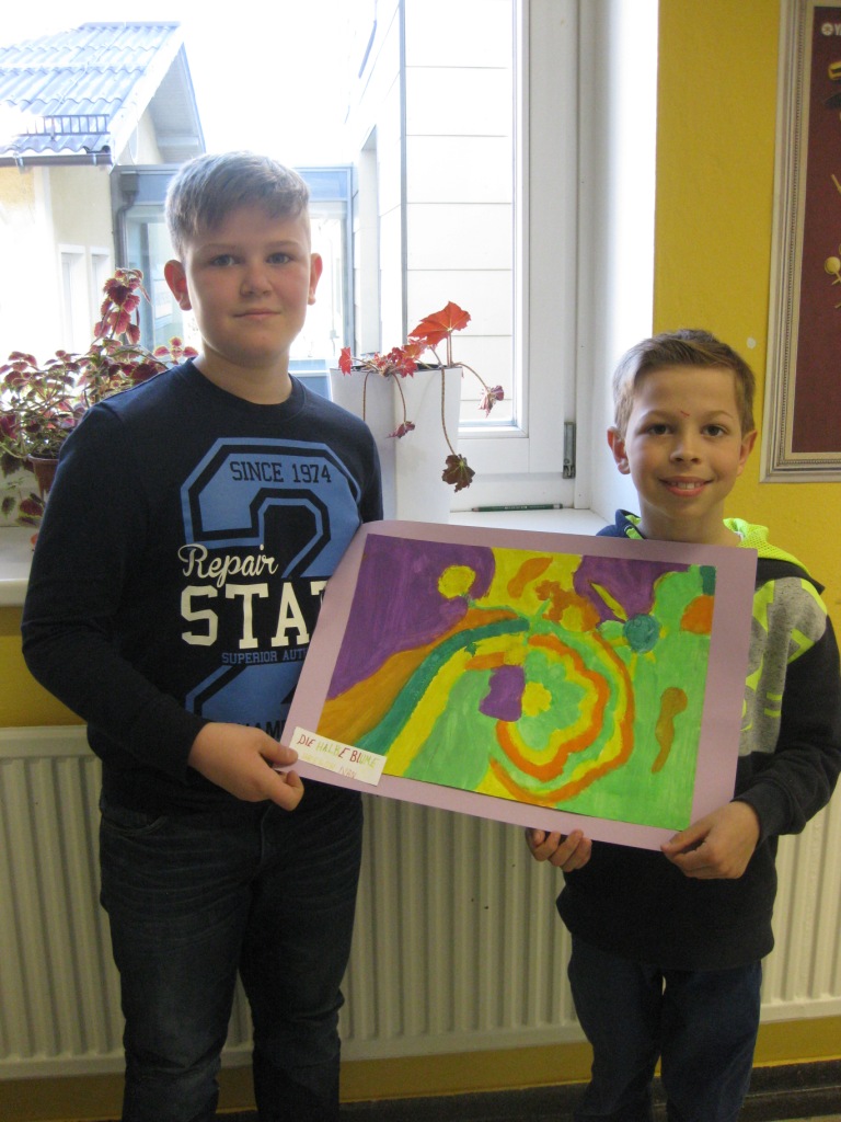 Unser Auftrag war, den Frühling in die Schule zu holen, also ein Frühlingsbild zu gestalten und das, ohne miteinander zu reden. So unter dem Motto: "Lass es entstehen!" zeichneten je zwei Kinder auf einem Blatt von der Bildmitte ausgehend nach außen.
