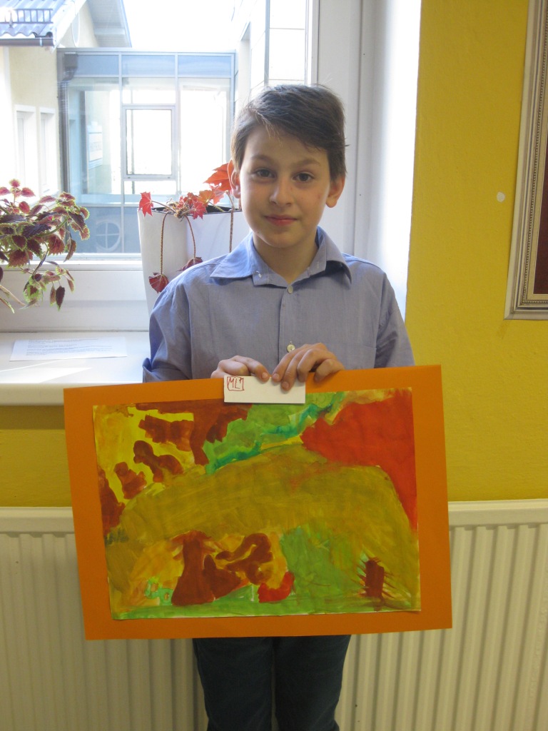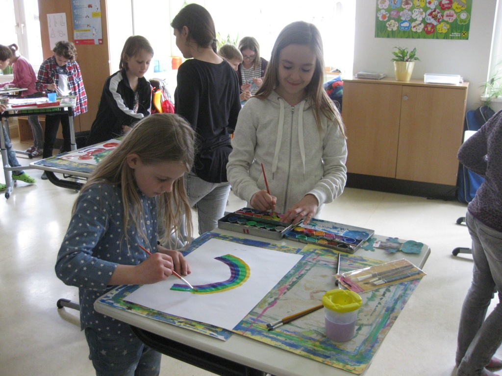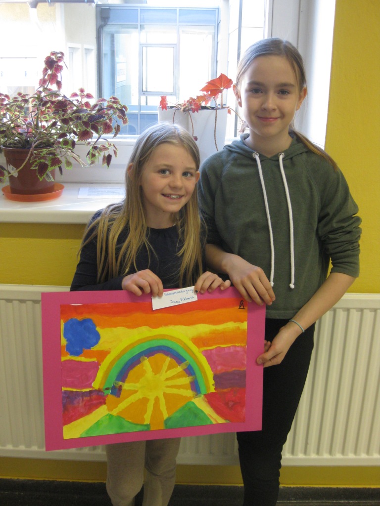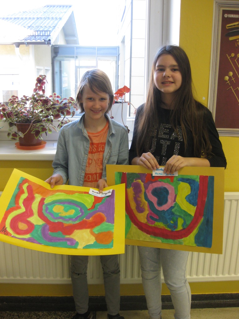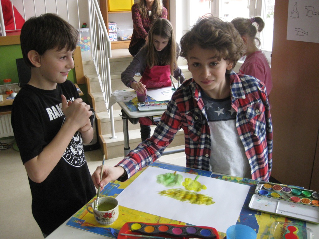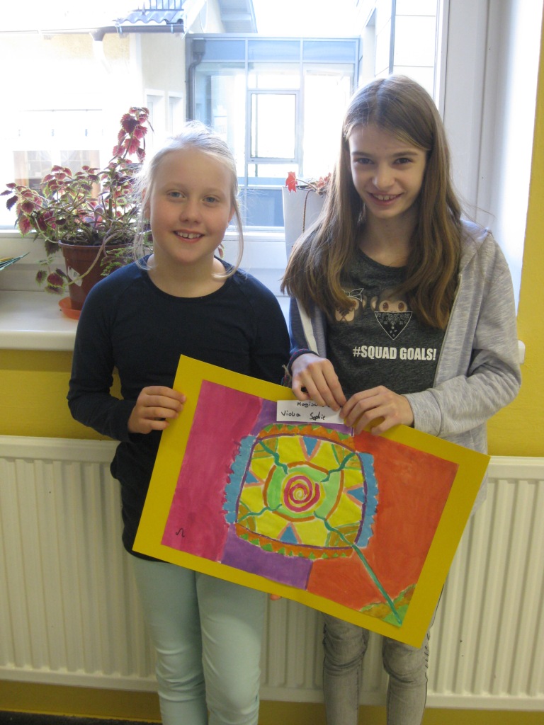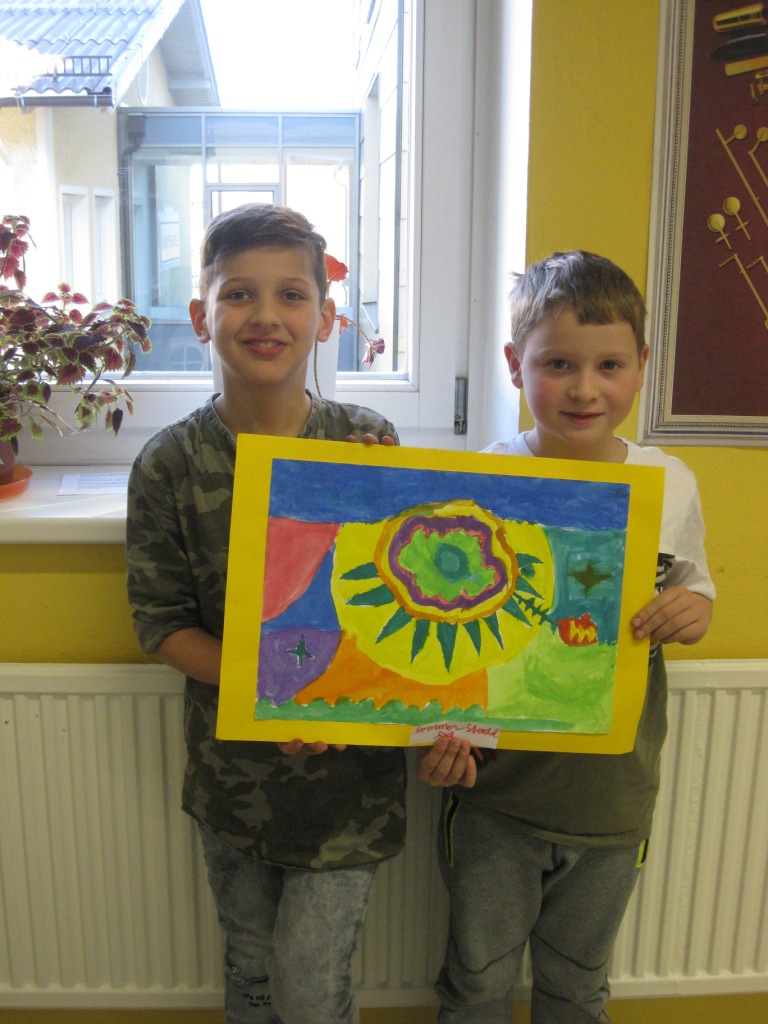 Unser Auftrag war, den Frühling in die Schule zu holen, also ein Frühlingsbild zu gestalten und das, ohne miteinander zu reden. So unter dem Motto: "Lass es entstehen!" zeichneten je zwei Kinder auf einem Blatt von der Bildmitte ausgehend nach außen.